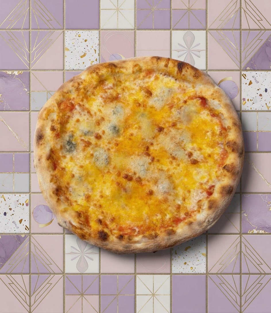 Salsa de tomate, mozzarella 100%, queso viejo tostado, cheddar, gorgonzola D.O.P. y parmesano D.O.P.