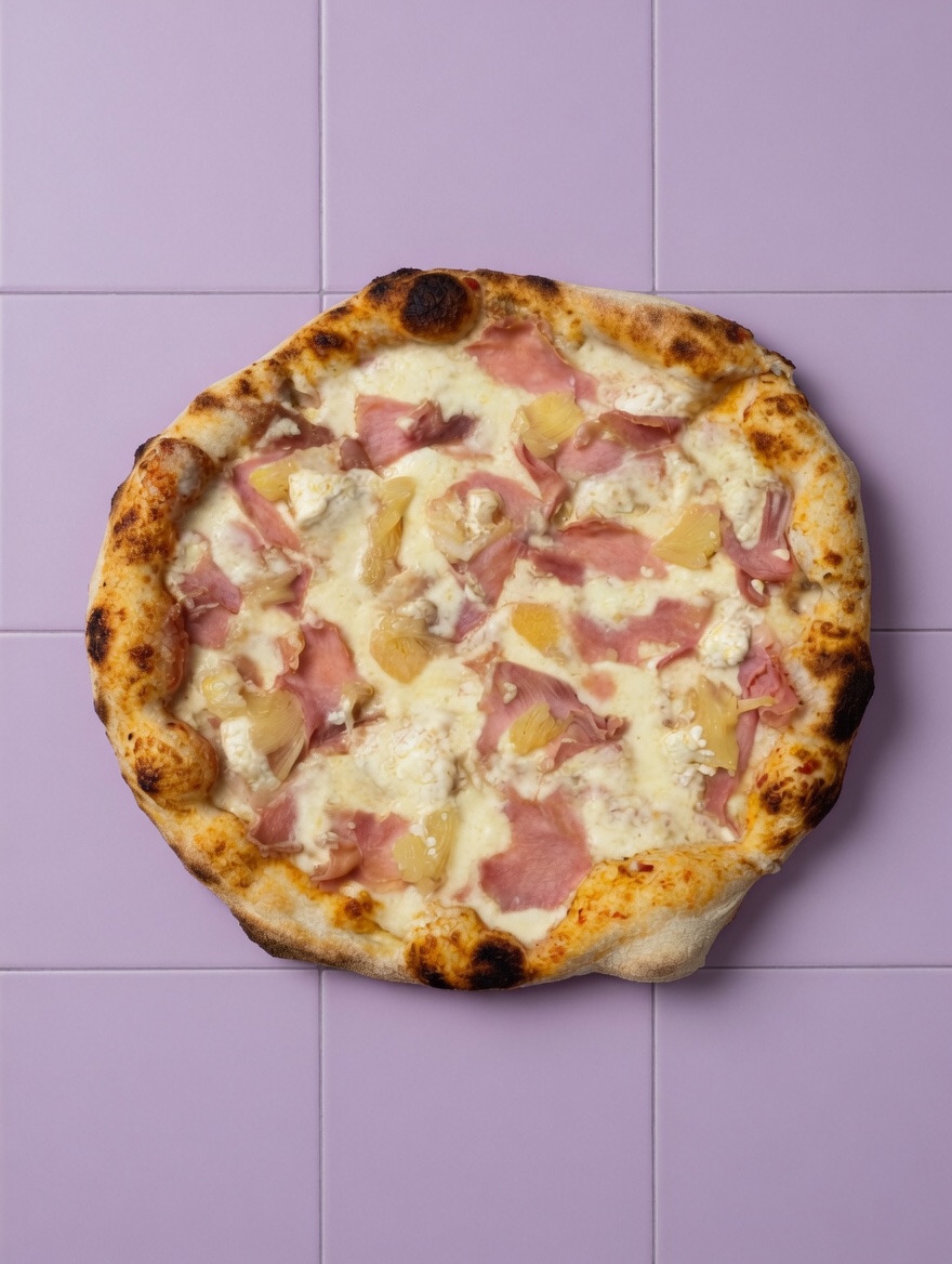Ingredientes: tomate natural, mozzarella 100%, prosciutto y piña