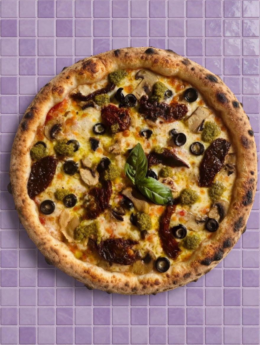 Salsa de tomate natural, mozzarella 100%, champis, olivas, tomate seco y pesto.