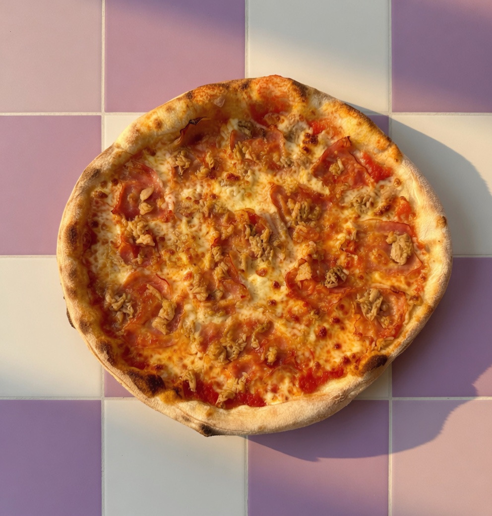 Salsa de tomate, mozzarella 100%, atún y bacon.