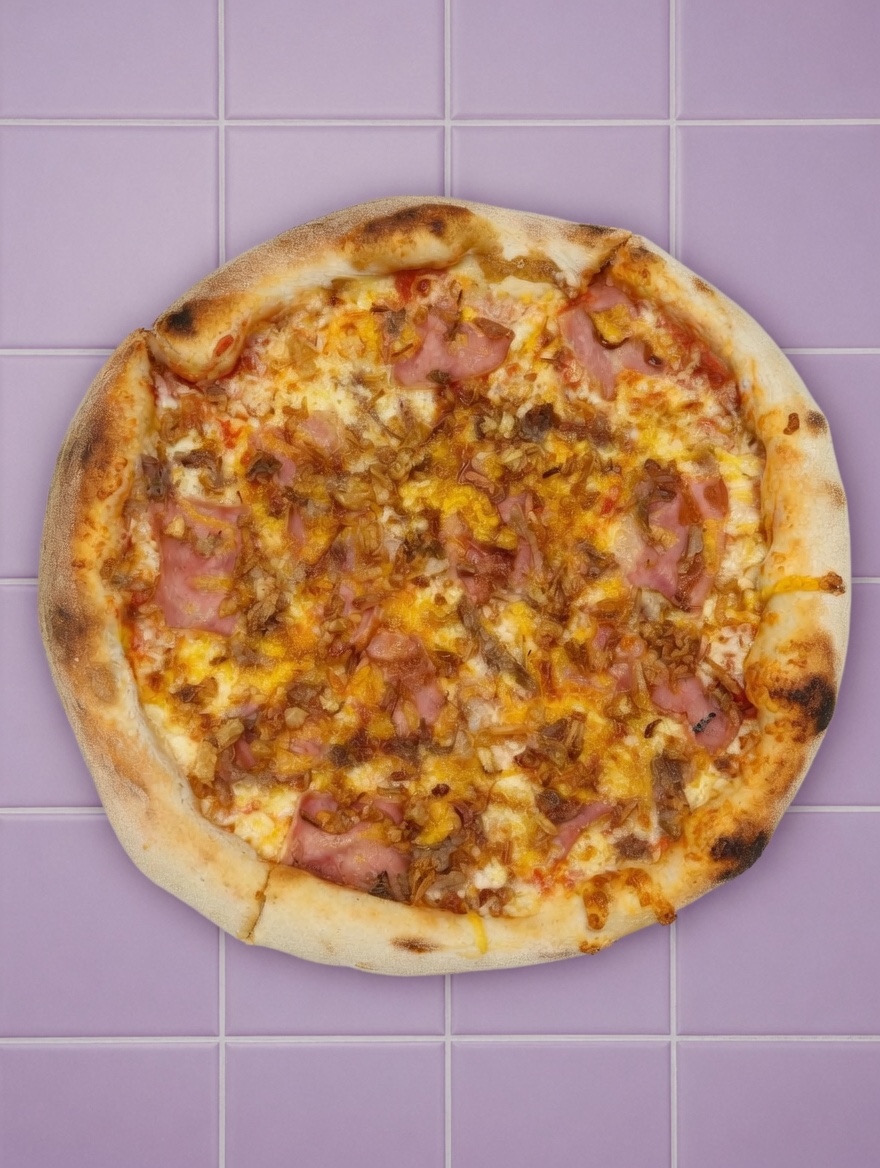Salsa de tomate, mozzarella 100%, bacon, queso cheddar, ternera, cebolla crispy y salsa bbq casera.