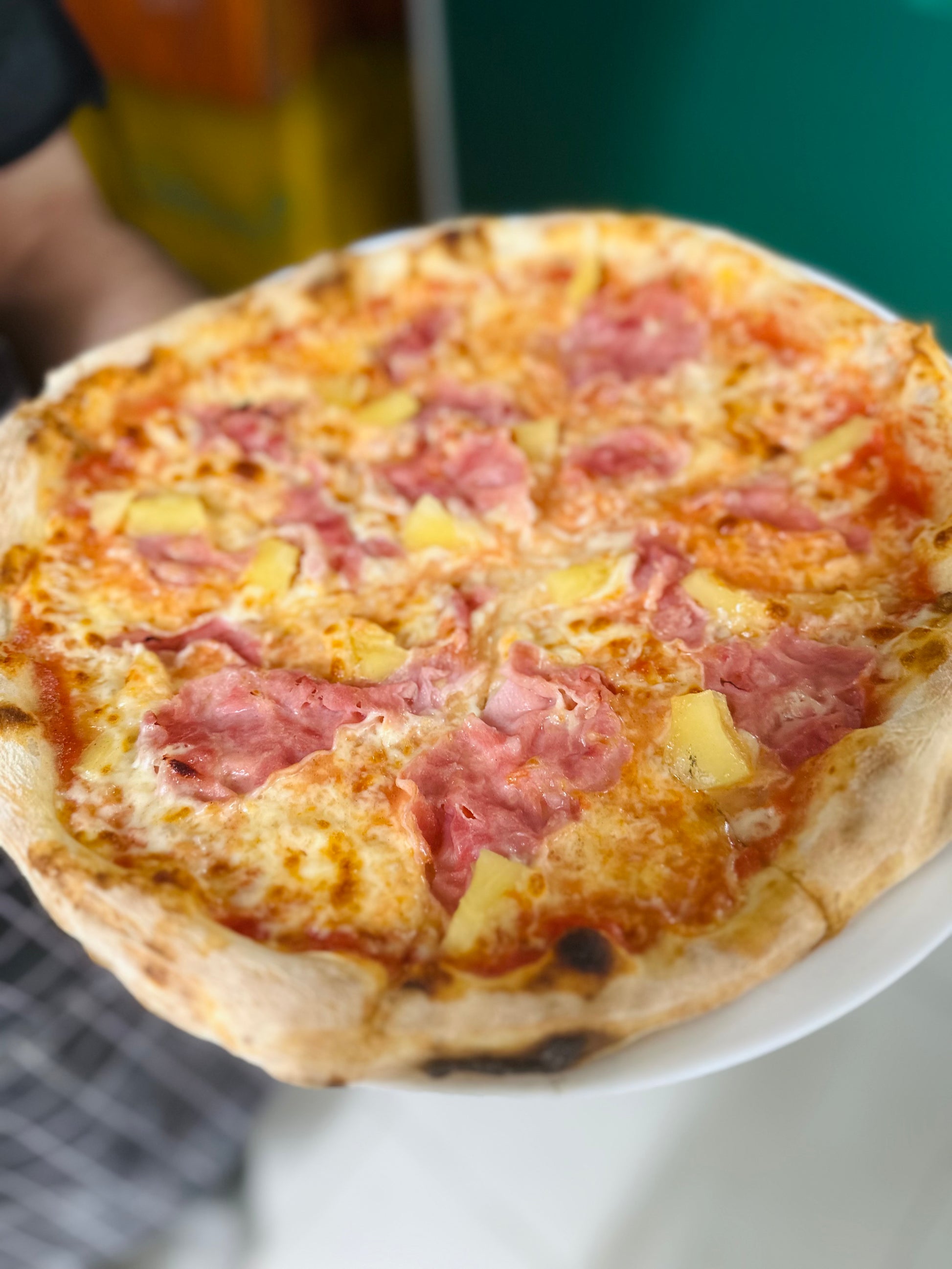 Ingredientes: tomate natural, mozzarella 100%, prosciutto y piña